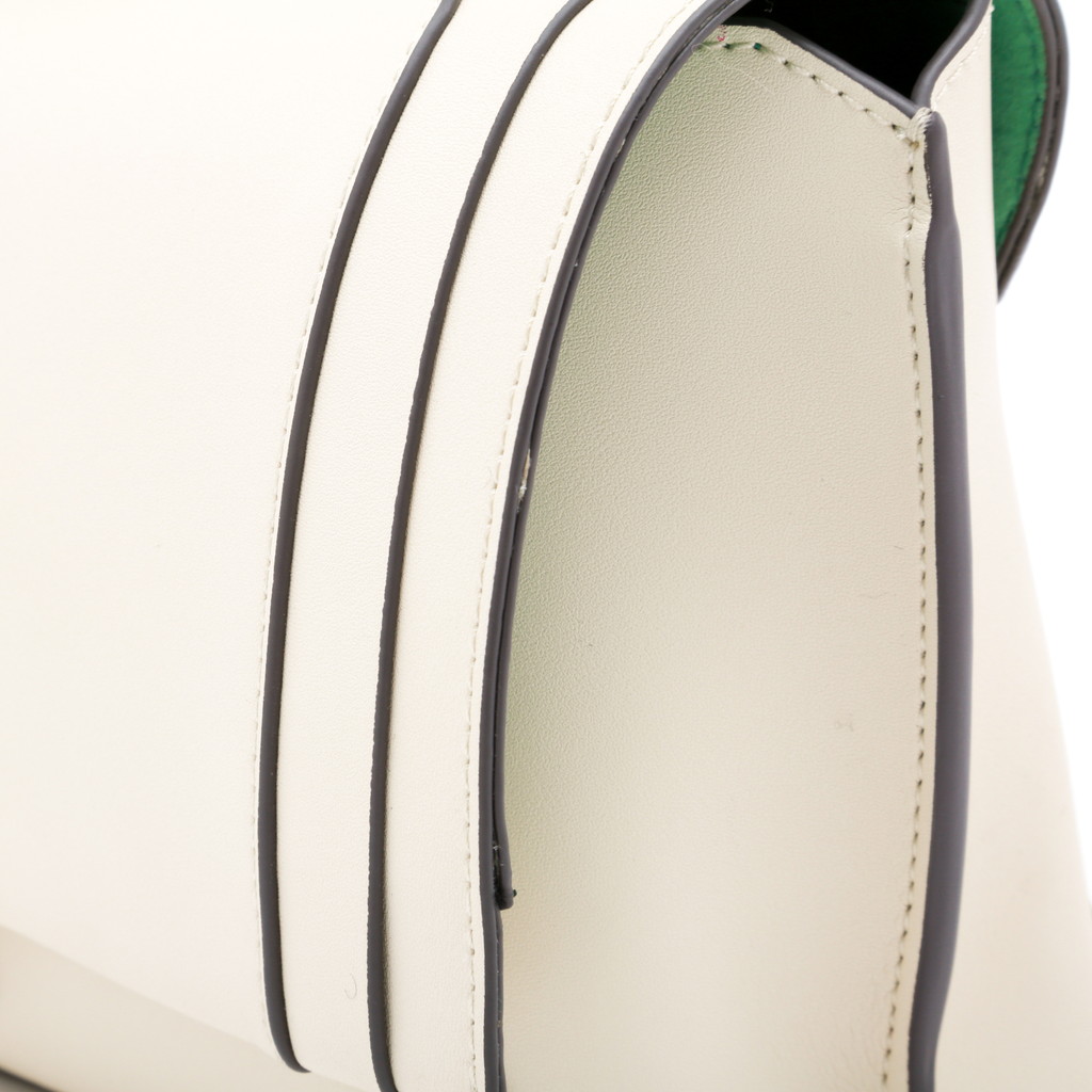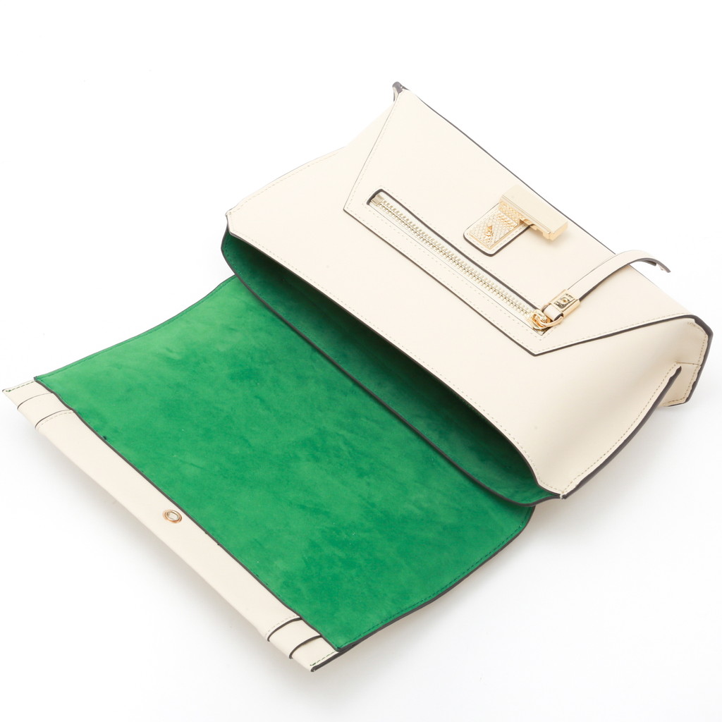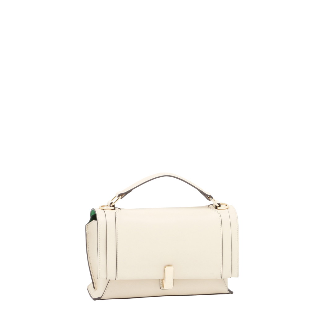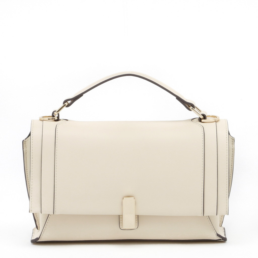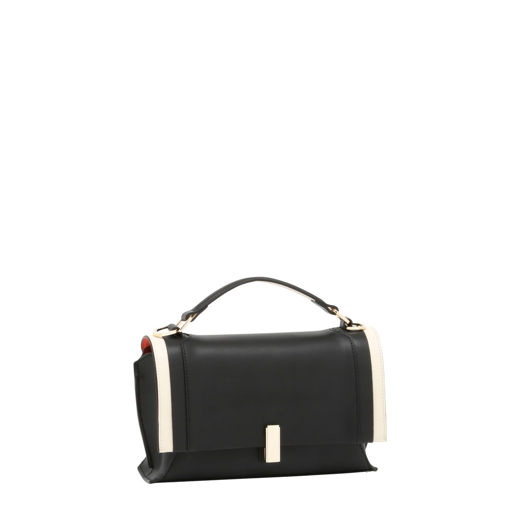フラップ端の切り替えがポイントになったハンドバッグです。フラップ先のロック金具は左右へターンさせる個性的な仕様。また、裏地には軽やかでフレッシュなカラーを使用し、春夏らしい優しいムードに仕上げています。中身を整理しやすい機能性に優れたデザインで、手持ちやショルダーバッグ、クロスボディとしても活躍します。