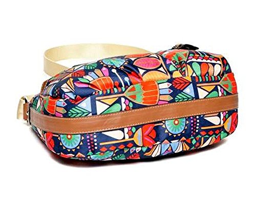 -. Feature : Material: Polyester, soft man made leather trim, and canvas handles. / Measurement: Approximately 12.50" W (widest area, east west) x 9.50" T (north south) x 3.50" D (side). Strap is approximately up to 24.00" drop. / Outside: 2 multi function pockets in the front, magnetic and zipper closure. 1 slip pocket in the back. / Inside: Double Section, side zipped pocket, 2 multi function pockets. / Imported. Placement of patterns is different and unique on each purse.