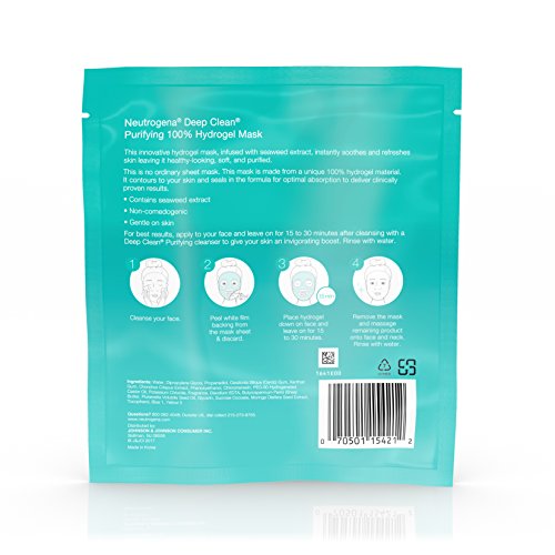 -. Binding : Health and Beauty -. Brand : Neutrogena -. EAN : 0070501154212 -. Feature : 1 count of 1.0 ounce purifying hydrogel sheet face masks with seaweed extract designed to instantly refresh and soothe skin / This innovative hydrating face mask is infused with seaweed extract and is made from a unique 100% hydrogel material for optimal absorption leaving skin healthy and purified / Non-comedogenic gel face mask is gentle on skin and provides clinically proven results / #1 Dermatologist-recommended brand hydrogel face mask holds up to 50% more essence than ordinary paper masks and leaves skin purified with a healthy looking glow / Use as part of a regular skin care routine by applying to face after cleansing and leaving on for 15 to 30 minutes. Remove the mask and massage remaining product into face and neck, then rinse with water -. IsAdultProduct : 0 -. Label : Johnson & Johnson Consumer Inc. -. Manufacturer : Johnson & Johnson Consumer Inc. -. NumberOfItems : 1 -. PackageQuantity : 1 -. ProductGroup : Beauty -. ProductTypeName : BEAUTY -. Publisher : Johnson & Johnson Consumer Inc. -. ReleaseDate : 2017-11-03 -. Studio : Johnson & Johnson Consumer Inc. -. Title : Neutrogena Deep Clean Purifying Hydrating 100% Hydrogel Face Mask, Oil-Free With Seaweed Extract, 1.0 Ounce (Pack of 12) -. UPC : 070501154212