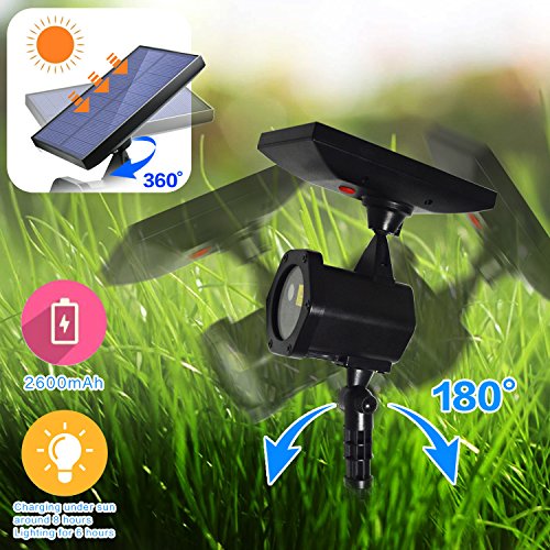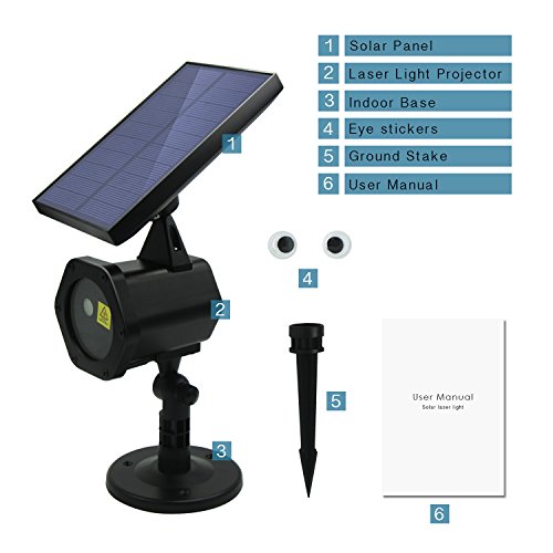 ✅ PACKAGE INCLUDED: Solar Panel Laser Lights Unit with Screw and Bracket x 1, indoor Base x 1, Ground Stake x 1, User Manual x 1,Eye Sticker x 2.