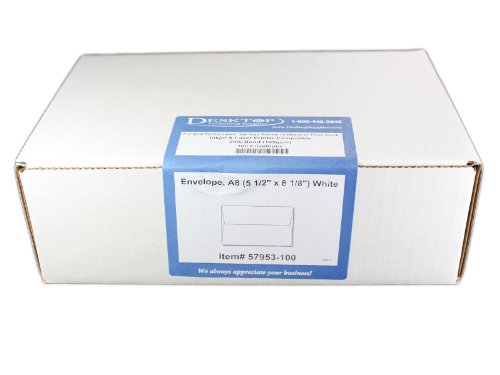 -. Feature : A8 Size Envelope (5 1/2" x 8 1/8") / White 24lb bond / 60lb text (90 gsm) Paper Stock / Inkjet & Laser Compatible / Square Flap / 100 Envelopes per pack