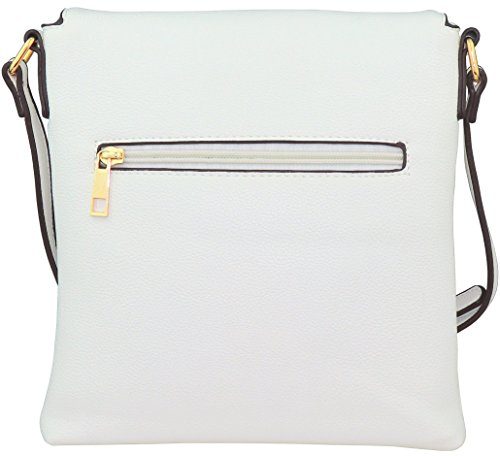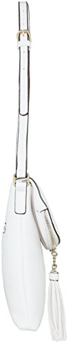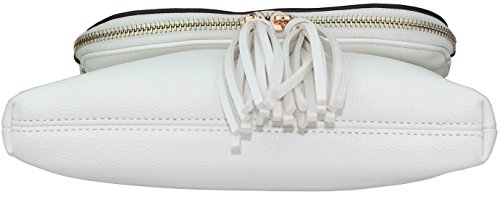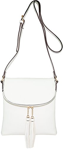 Fashion crossbody handbag that is made with faux leather with a black and white striped fabric lining. It has a zipper closure at the top of the flap which extends to the bottom of the purse that closes with a magnetic clasp. There are three other pockets: one zipper pocket on the back side of the purse, one pocket in the lining and a zipper pocket inside of the purse. There are tassel accents on the zipper on the flap.