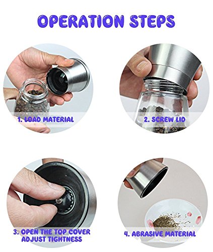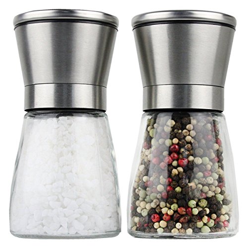- 【Utilities】: Each set contains one salt grinder and one pepper grinder, can hold salt, pepper, peppercorns or any other spice, in its generously sized glass reservoir
