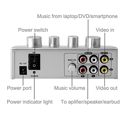 INPUT WITH SMARTPHONE,COMPUTER & TV: You can choose your smartphone, computer or DVD to plug to IN RCA interfacce via RCA line.Easily set up and works perfectly.The volume of background music from TV, computer or smartphone can be increased by rotating clockwise.