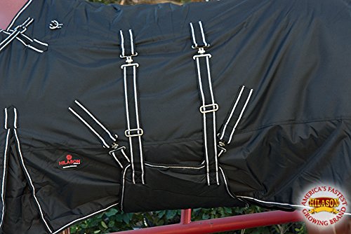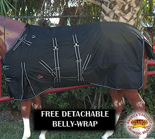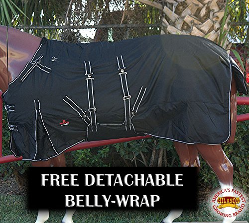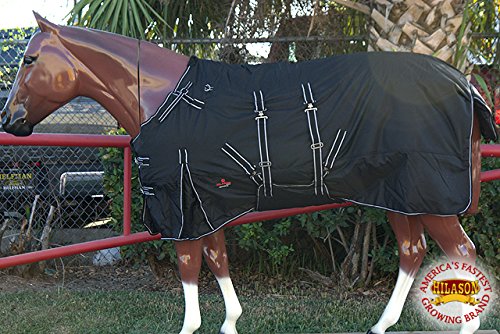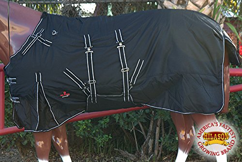 These Hilason Brand blankets are the perfect companion for your horse in cold and wet weather. Only the best materials are carefully sourced from around the world that is tailor made according to strict specifications which are based on customer needs and feedbacks. The blankets are Built on Heavyweight Toughmaster Brand 1200-Denier Rip-stop outer shell. ToughMaster is the one of the Best brands that makes top quality fabrics for the horse blanket industry. They are Ripstop, waterproof and breathable. These features are not just mentioned for fun but are lab tested to withstand over 10,000 PSI of air and water pressure, something even top brands are not able to withstand. It has 400g of High Grade Polygood Brand Polyfil insulation. Polygood Brand uses the finest Poly fibers which are designed to keep your horse dry, warm and cozy in the worst of weather. The lining is made of a highly Durable Persian Twisted Woven Tafeta Lining that will withstand the wear and tear of daily use. The double-stitched, taped and reinforced seems gives the blanket that extra strength and durability you would rarely find in most of our competitors. It has insulated tail flaps and to maintain the temperature and prevent cold air entry. Some of the other unique features of this blanket is the Belly Wrap System, Shoulder Gussets for easy movement, fleece at withers to prevent rubbing, double-buckle front closure, removable elastic leg straps and Dees on both side for easy attachment of hood or neck covers. 0 |