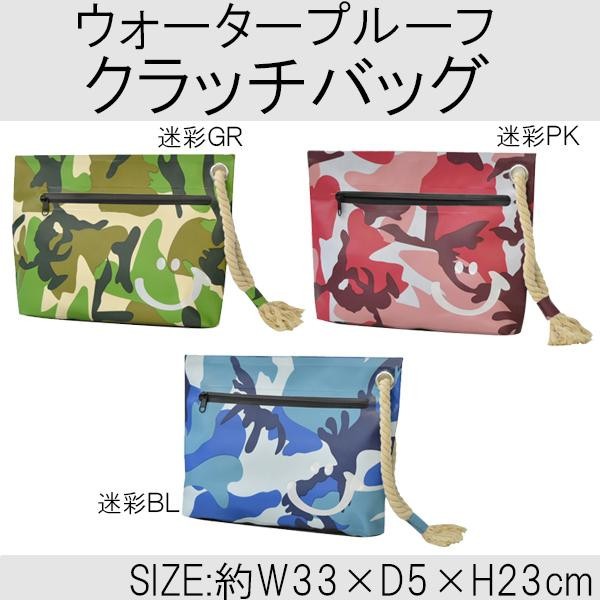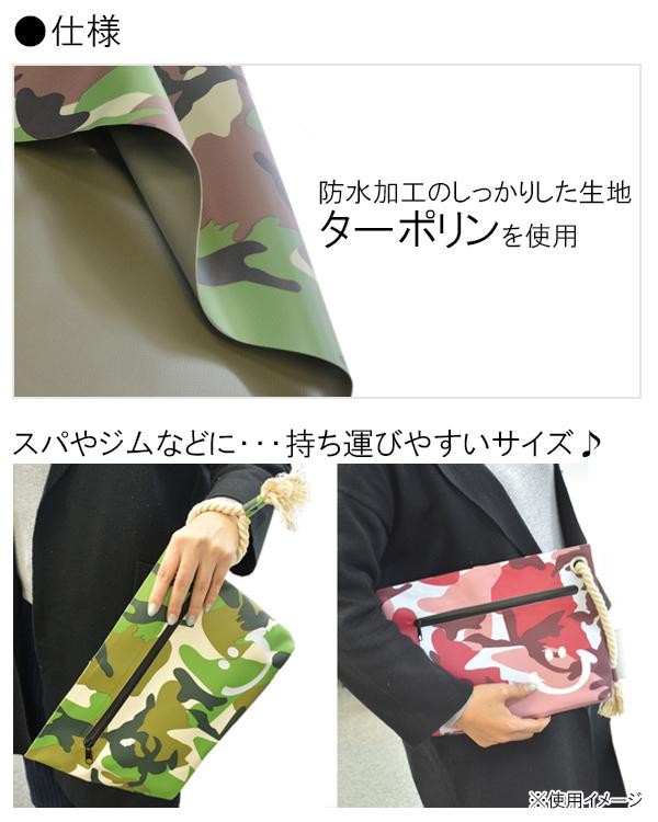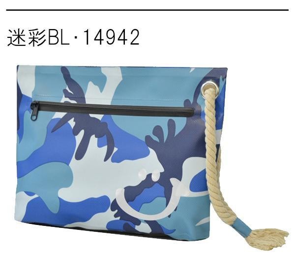 防水加工のしっかりしたターポリン素材のクラッチバッグ。財布やスマホ、貴重品を入れるのに便利!! 製造国:中国 素材・材質:PVC、綿、金属 商品サイズ:約W33×D5×H23cm(付属品含まず) 重量:160g 仕様:紐全長:50cmポケットなし 付属品:取扱説明書 ※サプライヤー直送品  ご注文後、当日~1営業日後の出荷となります【商品名】ウォータープルーフ クラッチバッグ 迷彩BL・14942