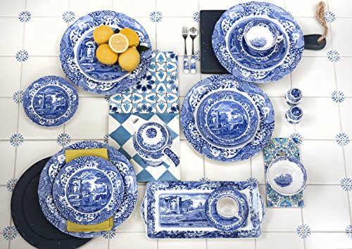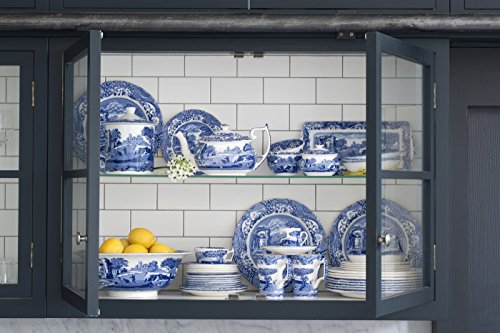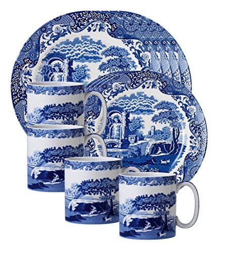 Amazon.com Review Introduced in 1816, Spode's Blue Italian dinnerware is a classic that has remained popular among collectors and diners throughout the centuries. This 12-piece set is ideal for daily dining as it includes four 10-inch dinner plates, four 8-inch salad plates, and four casual 9-ounce mugs that are all dishwasher- and microwave-safe. Referred to as "transferware," the elaborate pattern is engraved by hand onto copper plates and then transferred onto the ceramic by skilled artisans using blue underglaze--a process that was perfected back in 1784 but is still carried out today at the original Spode factory in England. Influenced by a ink and wash drawing from the 17th century, Blue Italian pictures Roman ruins within a pastoral setting in the center of the dinner and salad plates and around the exterior of the mugs. A fantastic floral border on the rims of the gently scalloped plates and the handles of the mugs shows influences from early Chinese porcelain designs. Made of high-quality glazed earthenware, this place setting is delicate in appearance but has been updated to meet today's standards of durability. A varied assortment of dinnerware and home decor items in the Blue Italian pattern is also available to complete a collection. --Cristina Vaamonde What's in the Box 4 dinnerware place settings. Each place setting consists of: 10-inch dinner plate, 8-inch salad plate, 9-ounce mug. 12 pieces total.
