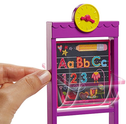 Explore careers with Barbie dolls and play sets that have fun features! the Barbie teacher doll comes with a toddler student and classroom set that covers lots of topics. The blackboard flips to reveal two different designs. A shelf and cabinets hold additional accessories like a plant, teddy bear, lunchbox and drink. And a chair seats the toddler doll for lessons. Barbie doll wears a career-themed outfit with sneakers and sunglasses.Feature