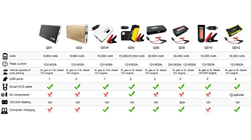 18000mAh high-capacity high-power rechargeable battery; Starting current: 450A; Peak current: 900A (3s); Support most 12V vehicle up to 8.0L Gas and 6.0L Diesel Engine
