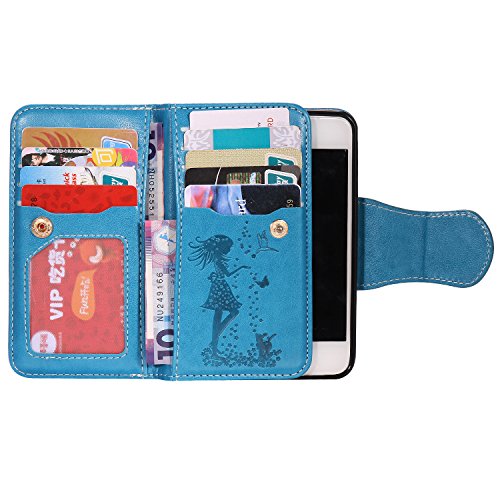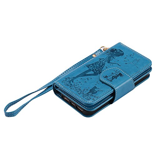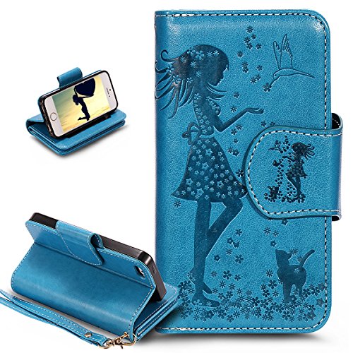 iPhone 5S Case,iPhone 5 Case,iPhone SE Case,ikasus Embossing Floral Flower Girl Cat Birds PU Leather Fold Wallet Pouch Flip Stand Credit Card ID Holders Case Cover for iPhone 5S / 5 & iPhone SE,Blue