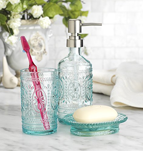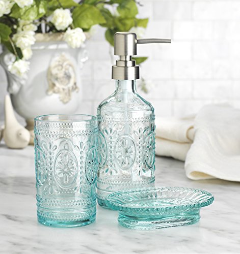 Classic Set of 3 Glass Bathroom ~Toothbrush Holder ~ Soap Holder ~ Soap Pump Lotion Dispenser (Blue)