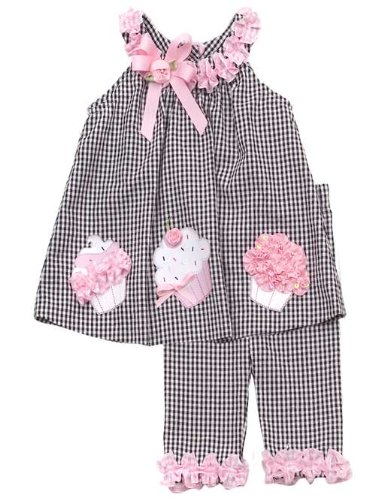 -. Binding : Apparel -. Brand : Rare Editions -. Color : Black -. Department : girls -. Feature : Delightful capri dress outfit from Rare Editions. / The sleeveless dress top features black / white checked seersucker fabric throughout, pink rusching trim along the yoke neckline, grosgrain bow & flower below the neckline, three adorable cupcake appliques decorate the bottom, and button back closure. Comes with a matching capri with pink rusching bottom trim. / Top & capri are 55% cotton & 45% polyester. -. ProductGroup : Apparel -. ProductTypeName : SHIRT -. Title : Rare Editions Toddler Girls 2T-4T Cupcake Applique Seersucker Capri set, Black/Pink