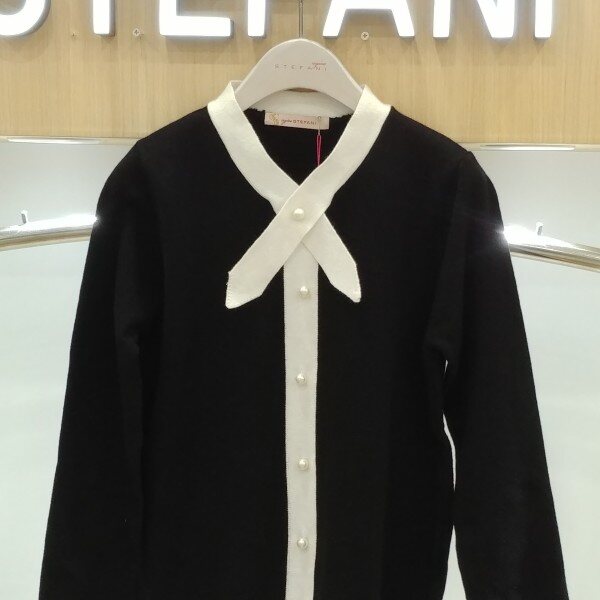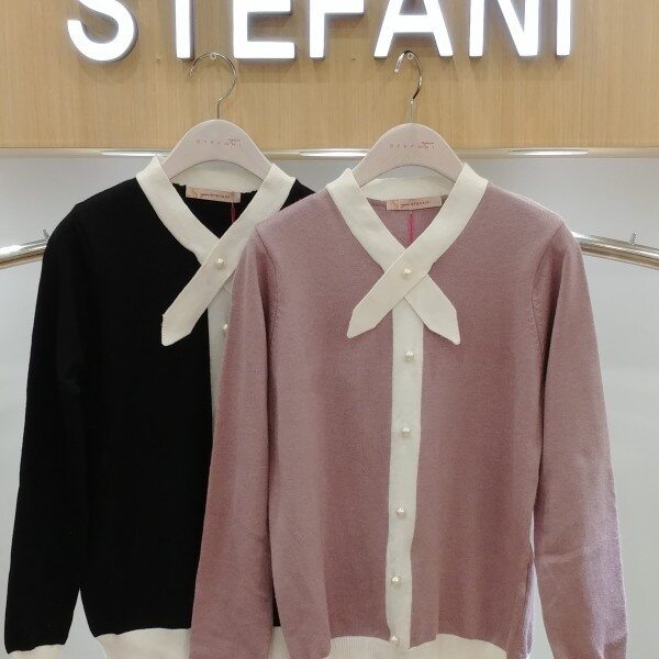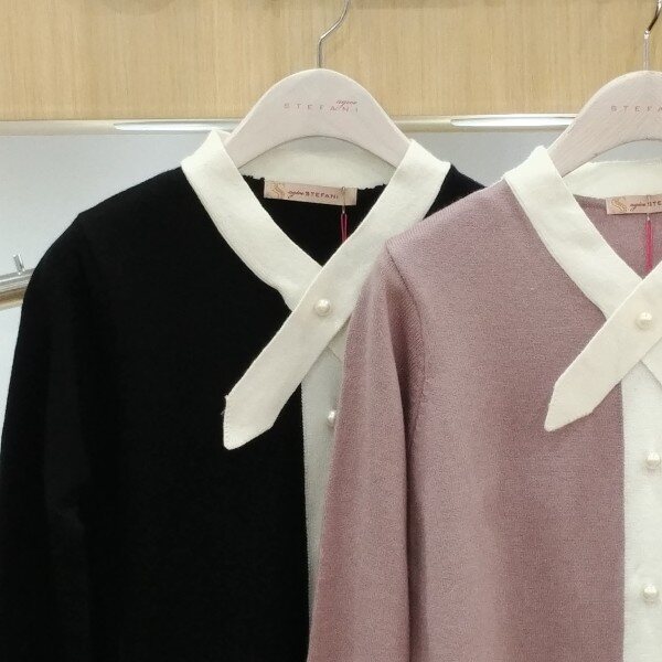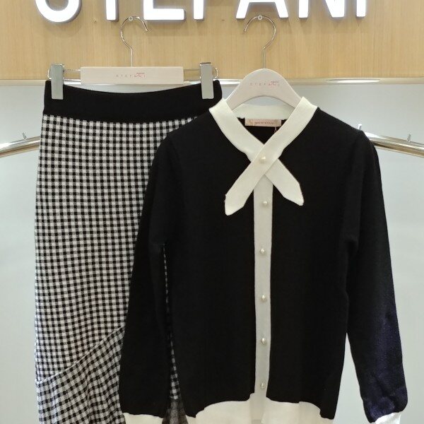 네크라인 리본 디테일과진주 포인트가 고븝스럽고여성스러운 니트티예요진주단추로 럭셔리한 연출을도와드리고 진주는 오픈 클로징되지않는장식용이예요숏한 기장감으로 스커트 팬츠등에다양하게 코디하실수 있는고급스런 느낌의 니트티추천해드려요