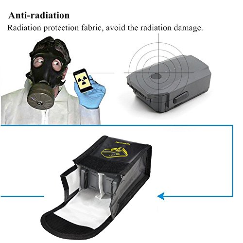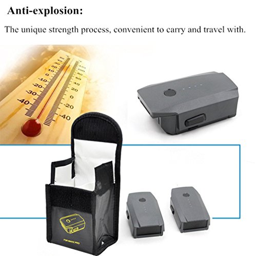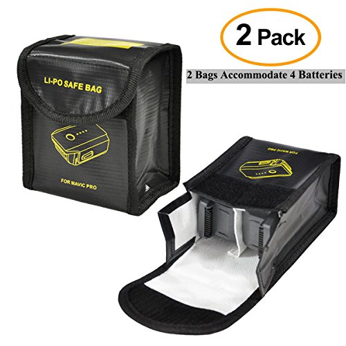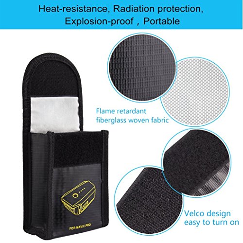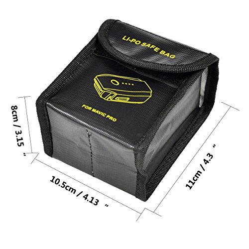 Used for safety charging and storage of dji Mavic Pro batteries,2 battery bag Accommodate 4 batteries This flame retardant bag is a convenient way of safe guarding your lipo batteries during charging, travel,transport,and storage Intensive Protection:Made of flame retardant fiberglass woven fabric,Heat Resistance,Explosion Proof,Radiation Protection Small Exquisite,convenient to carry;Velcro sealing design,convenient to use Product Size / Weight:4.13 x 4.3 x 3.15 inches (105*110*80mm) / 1.4oz (40g) 0