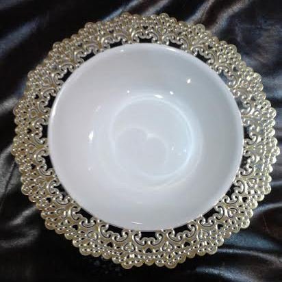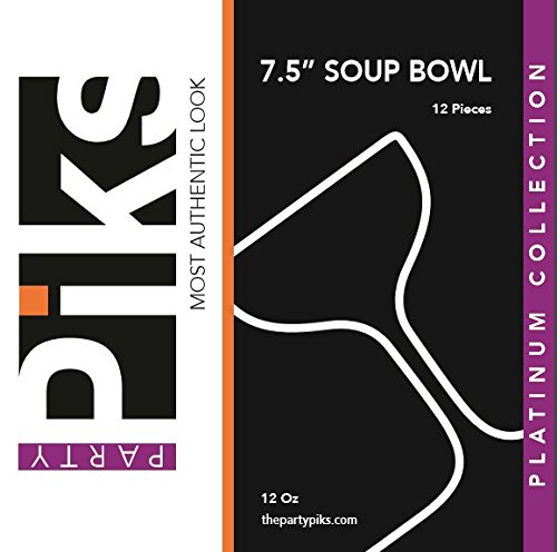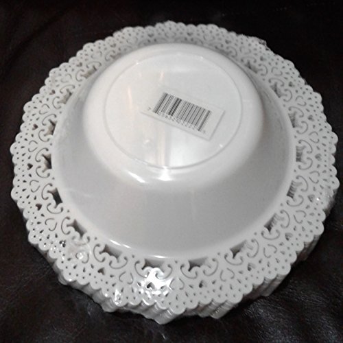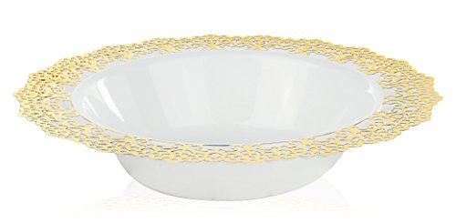 Elegant Disposable Plastic Dinnerware Plates - White Bowl with Gold Lace Trim - Hard & Reusable, Real China Look - 7.5" Inch - 12 Count (Gold)