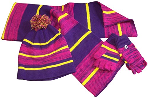 Binding : Apparel Product Description N'Ice Caps TM boy and girl 3 pc double knitted set. Great gift item. Sizes: one size fits 2-3yrs, one size fits 3-5yrs, one size fits 6-10yrs. Colors: black/neon yellow/grey heather, purple/neon yellow/fuchsia heather. Tested and approved as per CPSIA standards. 0