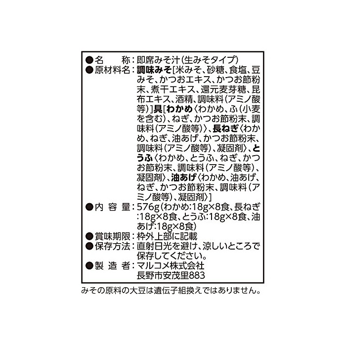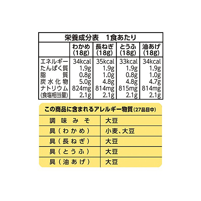 원재료:조미 된장[미 된장,설탕,식염,두된장,가다랭이 엑기스,가다랭이절 분말,자간엑기스,환원 맥아당,다시마 엑기스,주정,조미료(아미노산등)]구[미역〈미역,#(밀을 포함한다)고, 파,가다랭이절 분말,조미료(아미노산등)〉고, 파〈미역,파,유주고,가다랭이절 분말,조미료(아미노산등)고, 응고 제〉고, 두부〈미역,두부,파,가다랭이절 분말,조미료(아미노산등)고, 응고 제〉고, 유주고〈미역,유주고,파,가다랭이절 분말,조미료(아미노산등)고, 응고 제〉]