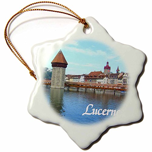 3dRose LLC orn_155659_1 Porcelain Snowflake Ornament, 3-Inch, "Lucerne-Town in Switzerland-Medieval Style Stone Tower Bridge Over Swiss Lake"