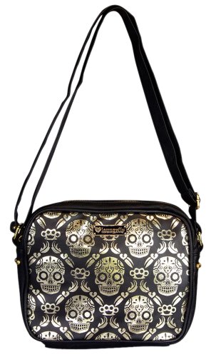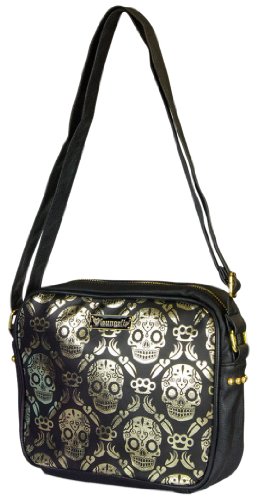 You'll be a knockout with this bold and gold Loungefly cross body bag! The gold metallic faux leather cross body bag is covered with a sugar skull and gold-knuckle pattern and features an awesome metal plaque.Feature