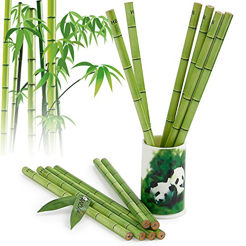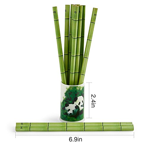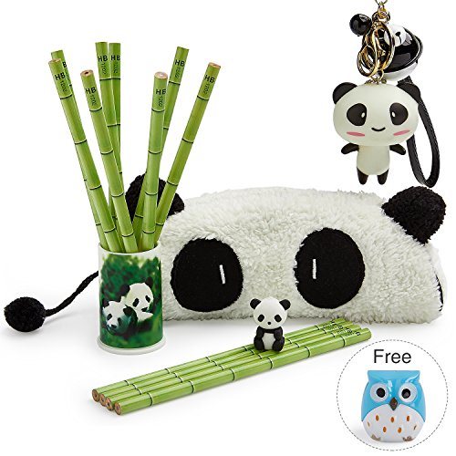 Super Cute Set: Useful and portable penda office set, include 12pcs bamboo pencil, One eraser, One panda pencil holder, One panda key chain, Color of key chain will random delivery and a free sharpener