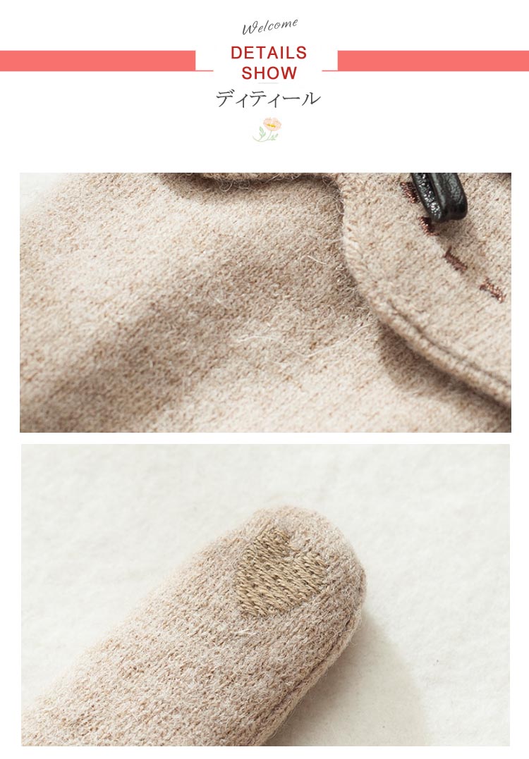 | 備考 | 注意★洗濯時、色落ちがございます。他の物とのお洗濯もお控えくださいませ。 湿気を含んだ状態や水を含んだまま放置しないでください。 この製品は洗濯で若干縮むことがあります。洗濯機は使用できません。 ※ベージュ×モカのみ使用糸の関係上、風合いが少々異なります。 |