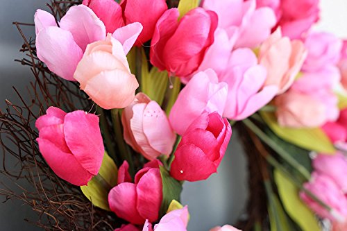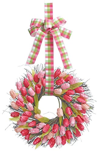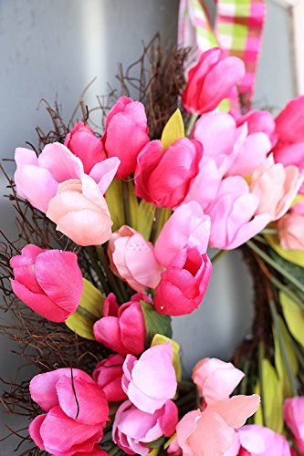 21 Inch Spring Front Door Tulip Wreath, Artificial Spring Tulips with Plaid Hanging Ribbons on a Natural Twig Base