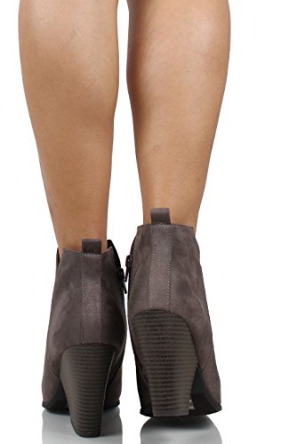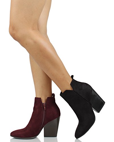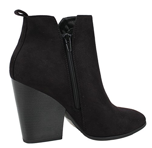 Product Description Chunky heel anke bootie featuring almond shape toe, faux suede material, V side cut with inner zipper for easy on/off, and chunky heel measures approx. 4". 0