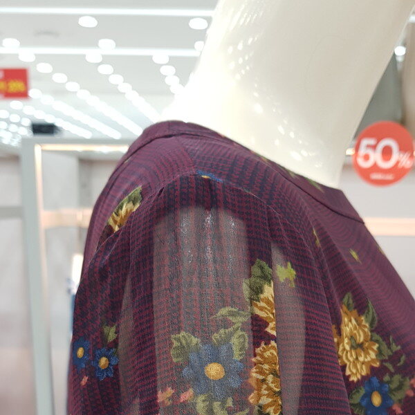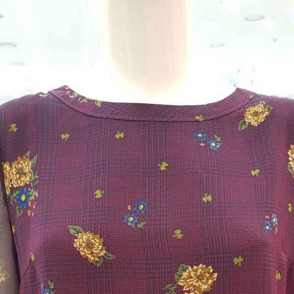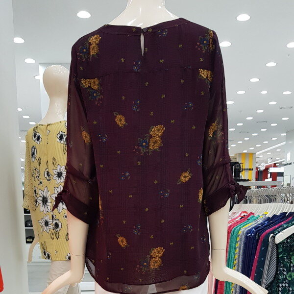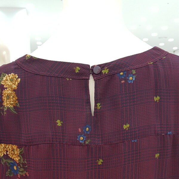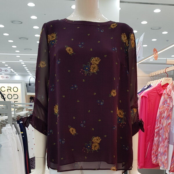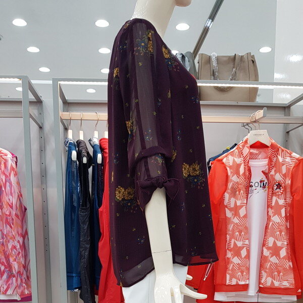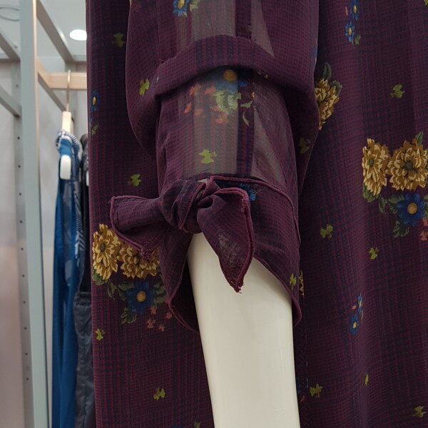 얇고 가벼운 폴리소재의 체크와 꽃이 믹스된 프린트 블라우스. 라운드 네크에 소매 리본 디테일로 포인트를 준 간절기 블라우스.