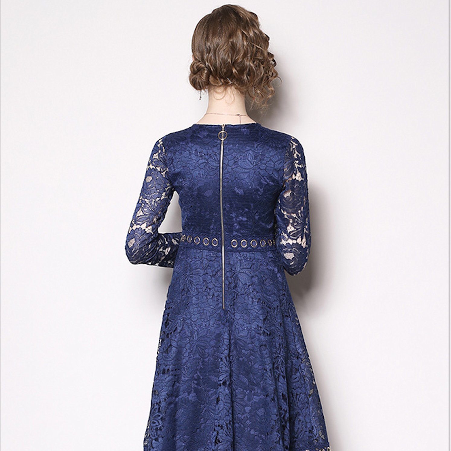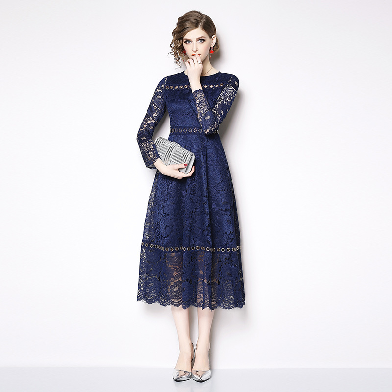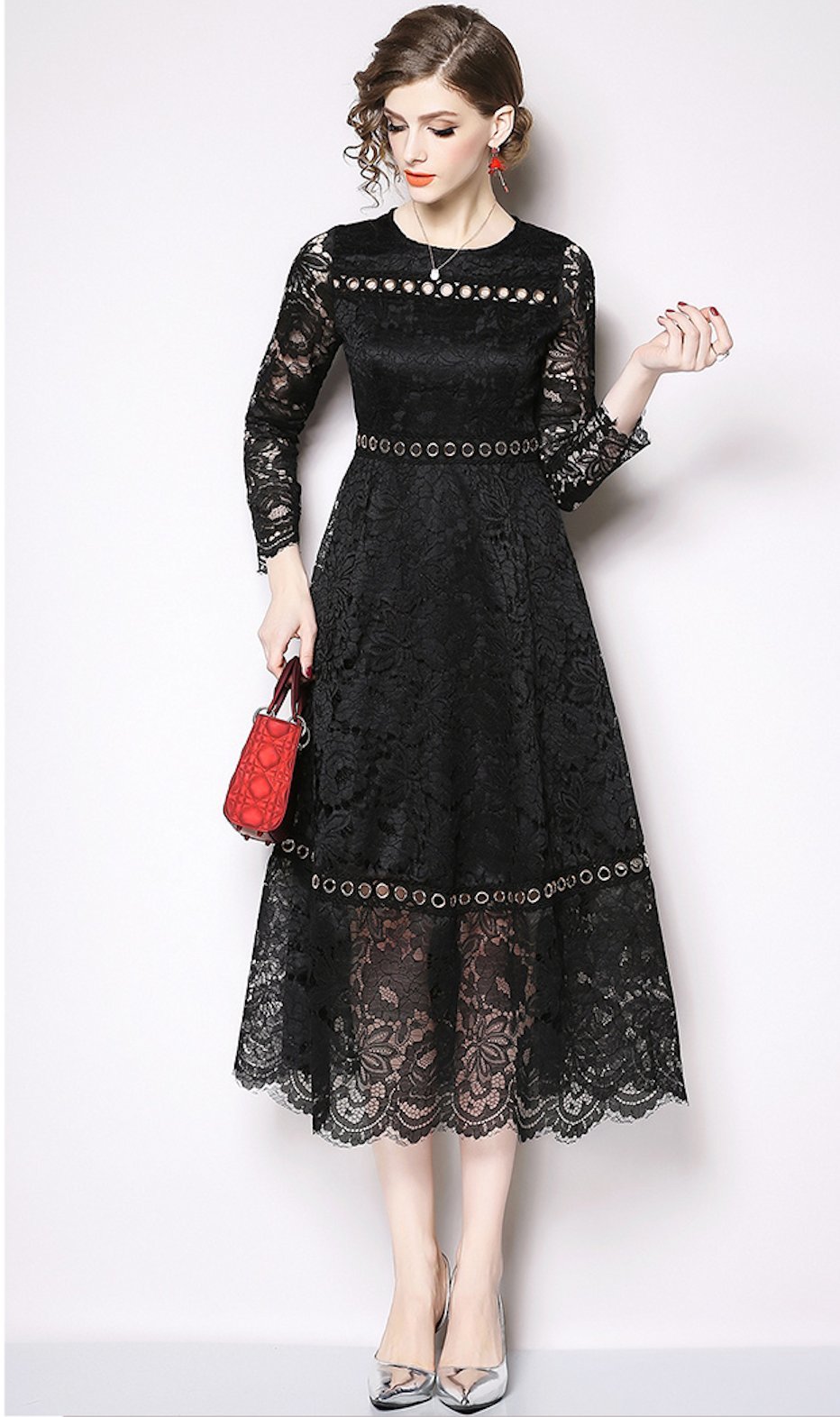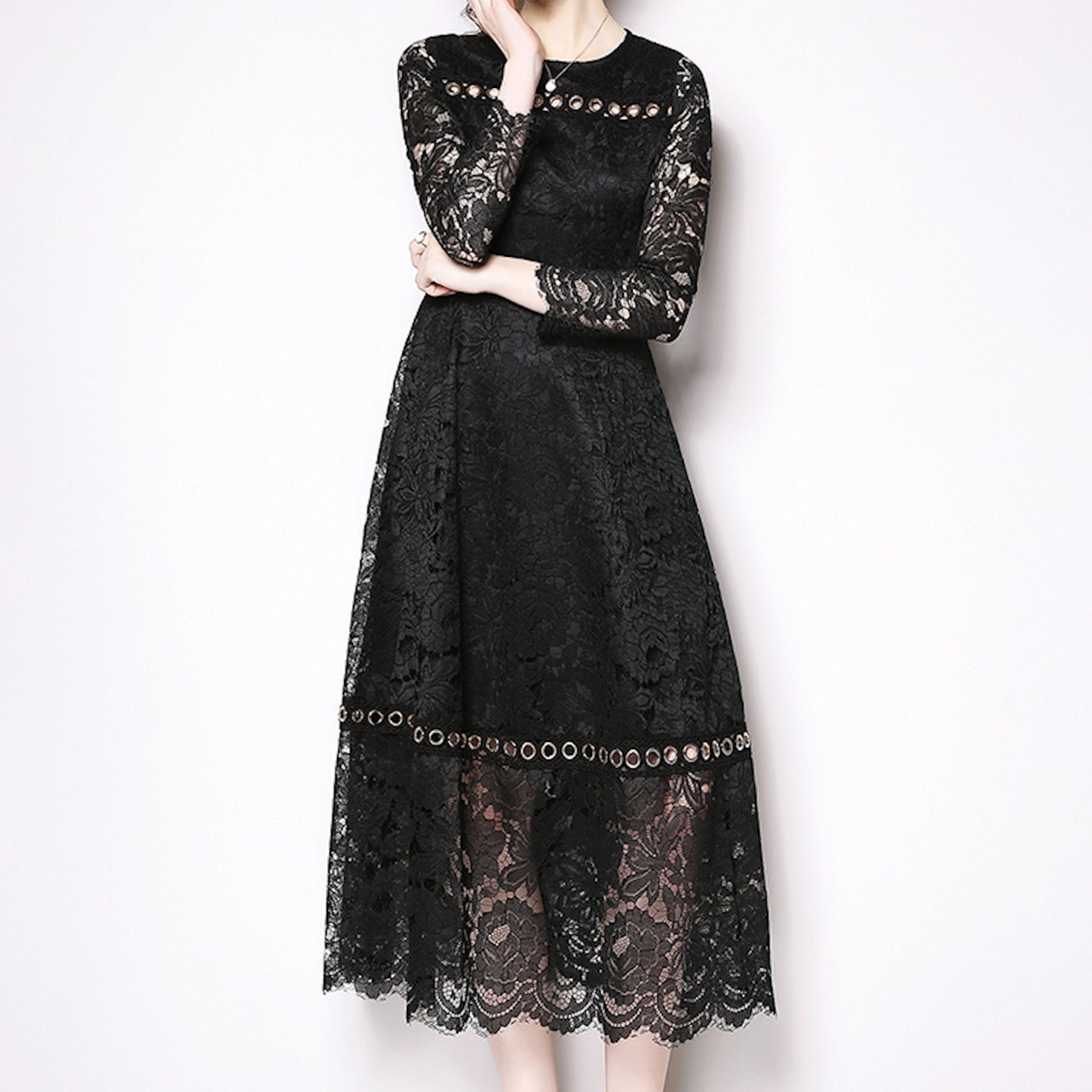 大人エレガント 花柄 総レース ミモレ丈 フレア ワンピースドレス 透け感 クルーネック 大人女子 きれいめ お呼ばれ 結婚式 長袖