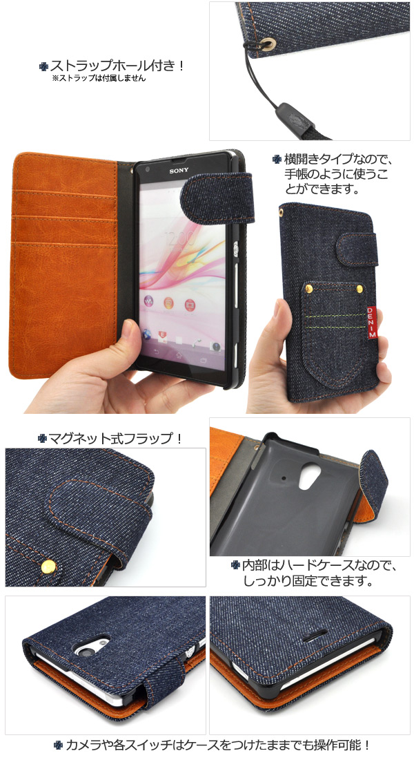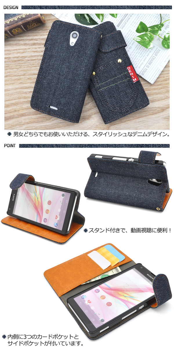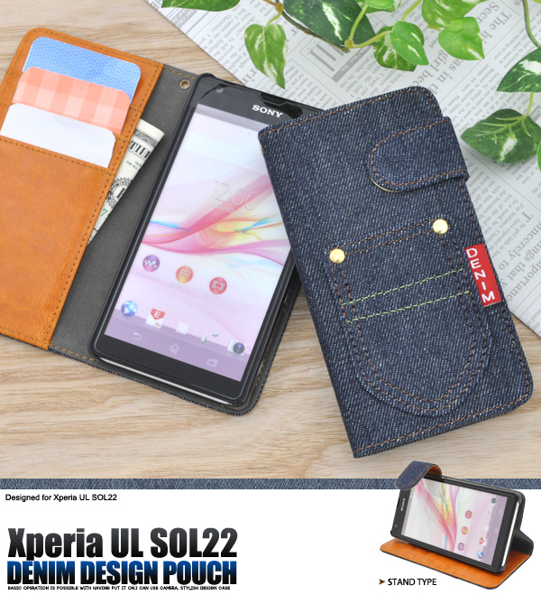 デニムデザインのXperia UL SOL22用スタンドケースポーチ。
