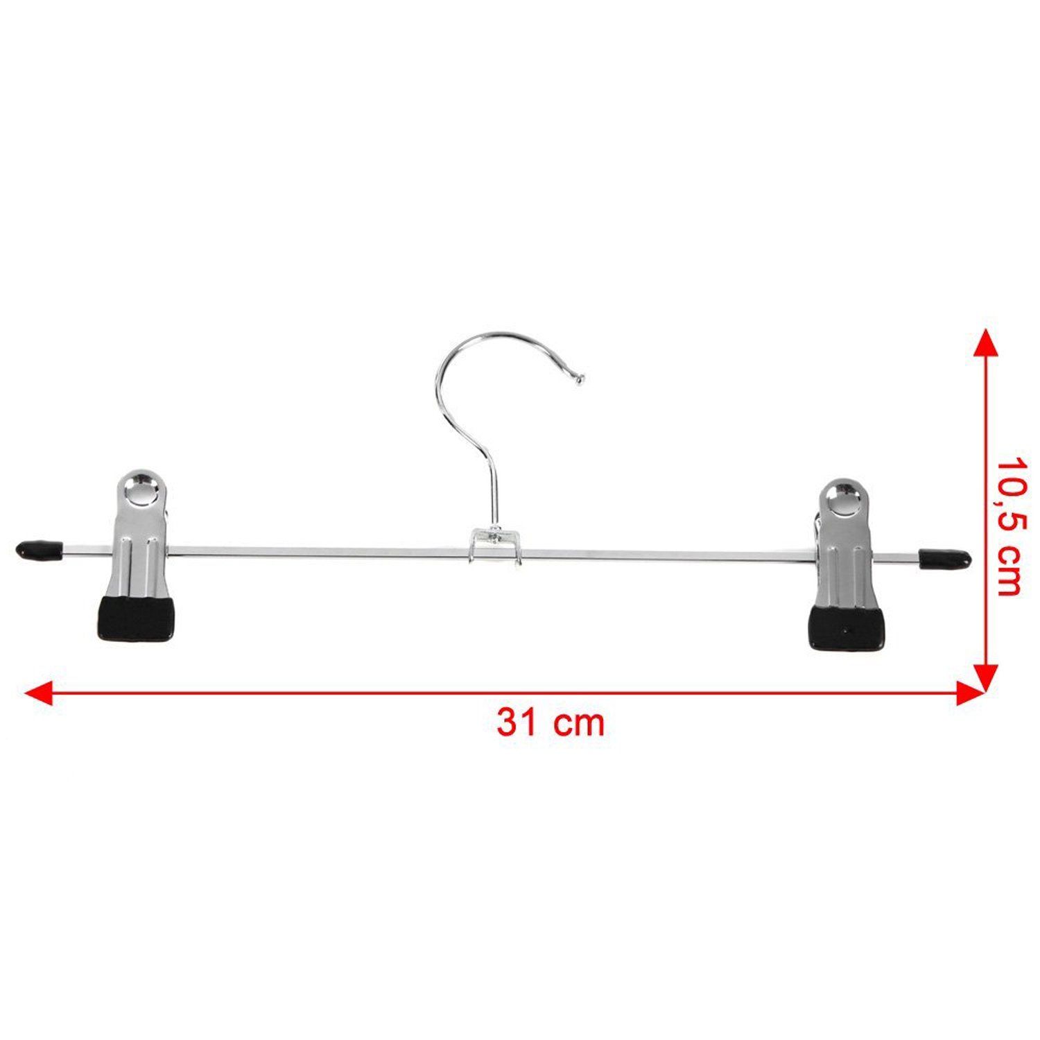サイズ:1本/約 10.5×30.5×2.5cm 、重量:1本/約75g 。 材質:本体/スチール(PVC特殊樹脂コーティング)、フック/スチール(ニッケルメッキ)。 ハンガーラックやクローゼットに等間隔で使用することで、お店のような統一感とすっきりしたイメージを持たせるパンツ・スカート用ボトムハンガー。 フックは便利な360度回転。クリップ内側のゴムで衣類を傷つけず、しっかりキャッチ! スカート、ズボン、マフラーなど様々な用途に適した歴史あるドイツ製のハンガーです。