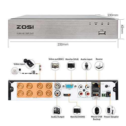 -. Feature : ZOSI H.264 8 channel 1080N/720P Digital Video Recorder ,Includes 4x 1280TVL bullet Outdoor Security Cameras.No include Hard Drive / This 8channel 4-in-1 DVR which supports Analog, HD-TVI, CVI ,AHD Camera. it provides you the flexibility to extend additional cameras.You can add more 4pcs 720P or 1080P cameras. / Build-in 24pcs IR led with IR Cut Filter ensures true color under all lighting conditions day or night, night vision up to 20meter (65 feet) / Email Notification & Mobile Push Alerts when Motion Detection,Free Apps for Live View and Playback on Smartphone.Support USB port Back up , gives you the easiest option of backing up and transferring your video footage to a USB flash drive / Two year quality Warranty, Life time Tech Support ! If your product stops working in the first year we will replace it.