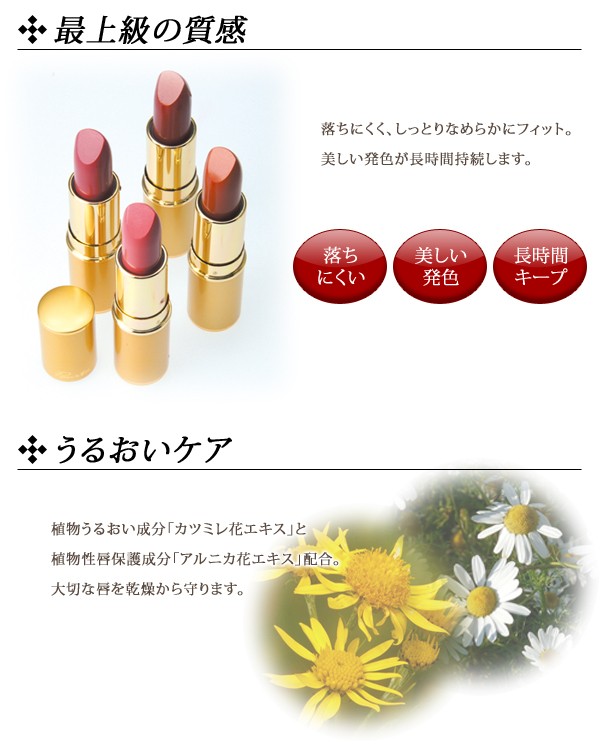 | 落ちにくく、美しい発色が長持ちします。植物性うるおいエッセンス配合で唇を乾燥から守ります。無香料・防腐剤無配合。唇/口紅/リップスティック/落ちにくい/発色/潤う/保湿/乾燥/繰り出し |