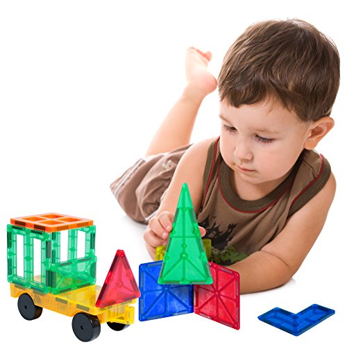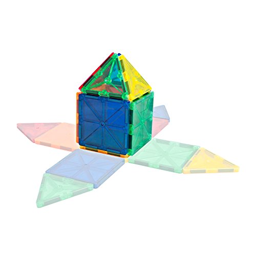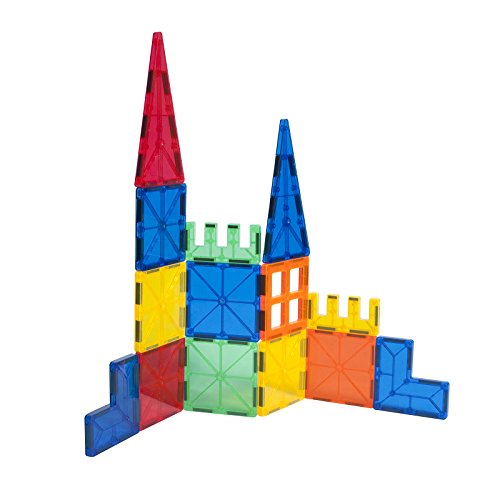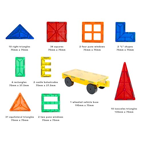 Let your imagination run wild with TYTANs Magnetic Tiles. Build literally thousands of different 3D towers and structures with these easy to use magnetic tiles. Box includes: 31x Equilateral Triangles 10x Right Triangles 10x Isosceles Triangles 34x Small Squares 4x Rectangles 2x Four Pane Windows 2x Two Pane Windows 4x Castle Balustrades 2x "L" Shapes 1x Wheeled Vehicle Base Warning: Choking hazard, Set contains small parts. Not suitable for children under 3 years.Feature
