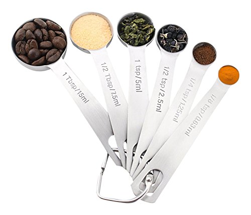 - ALL IN ONE. Wuudi Stainless Steel Measuring Spoon Set includes 6 measuring spoons: 1/8-tsp, 1/4-tsp, 1/2-tsp,1-tsp, 1/2-Tbsp and 1-Tbsp. All in one set for your needs.