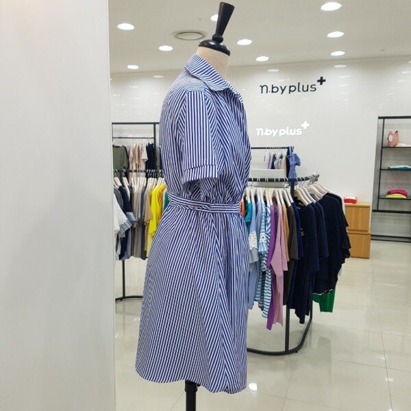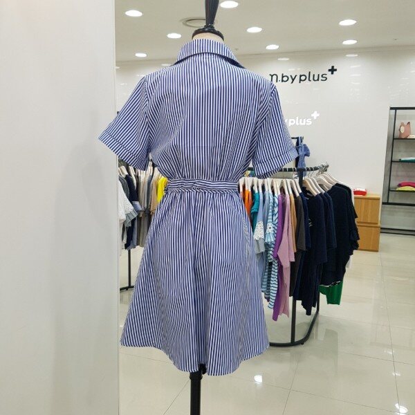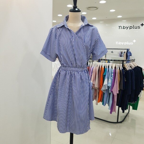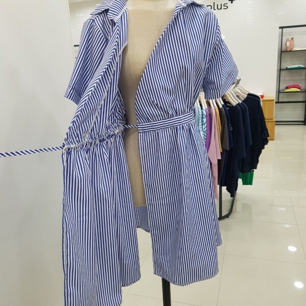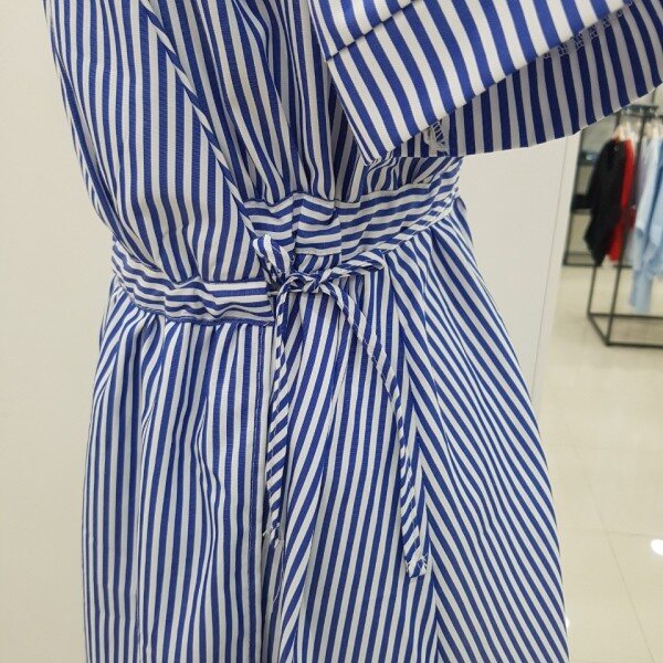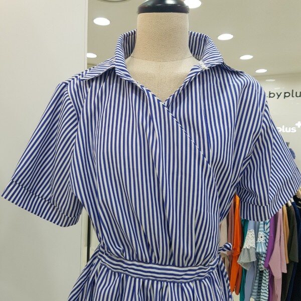 랩원피스 스타일의 롱블라우스입니다.블루 색상의 스트라이프가 시원함을 더해주는 세련된 아이템이에요.