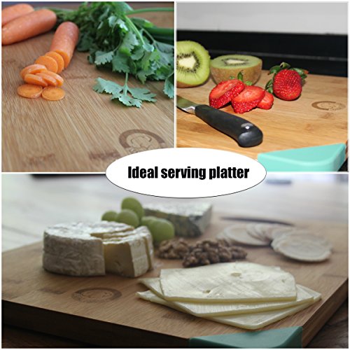 • LARGE BUT NOT OVERSIZE - super reversible design and sturdy cuttingboard with rounded non-slip silicone corners that maximize safety and functionality, making it an essential size item in your kitchen. Great for serving a meal while entertaining. Perfect as a serving dish for cheese, crackers, bread plate, butcher meats, sushi, pizza, fruits, vegetables or any food