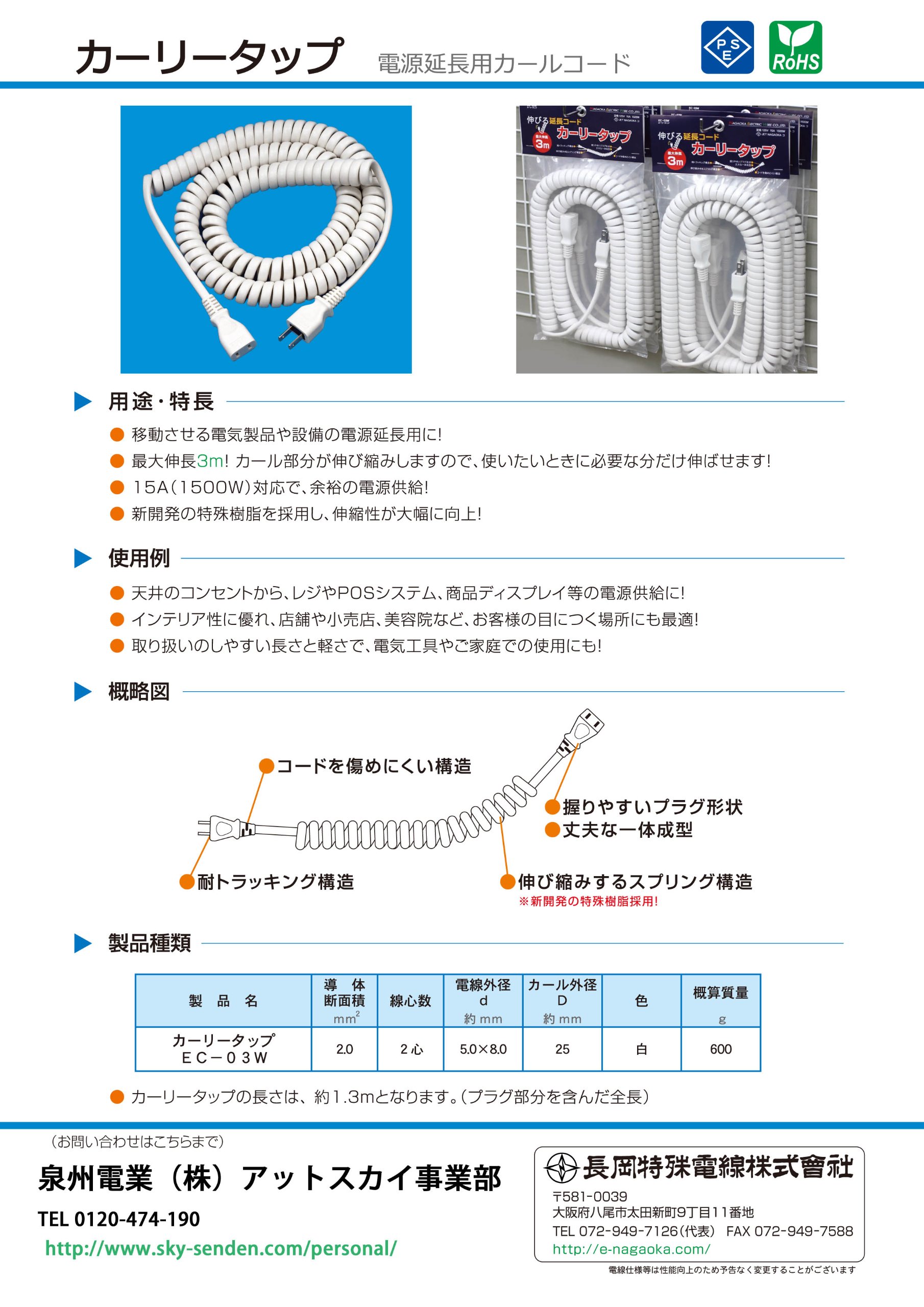 [Product specifications] Product name EC-03W / Conductor cross-sectional area 2 m 2 / Line core number 2 Heart / wire outer diameter about 5.0 × 8.0 mm / curl outer diameter about 25 mm / color white /