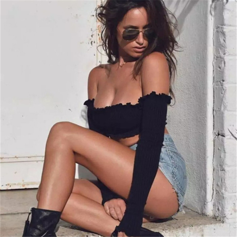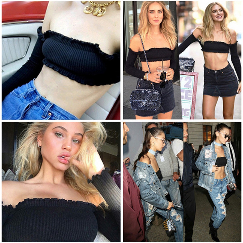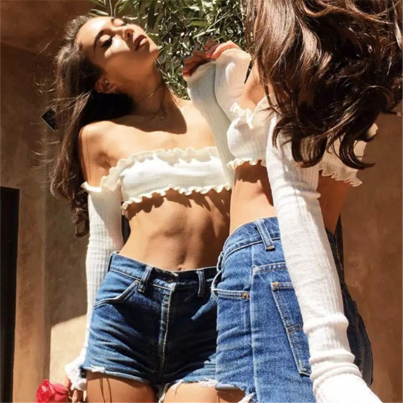 Features: Solid Color/ Off the Shoulder/ Strapless Ruffle/ Long Sleeve/ Slim Fit/ Short Tube Crop Top