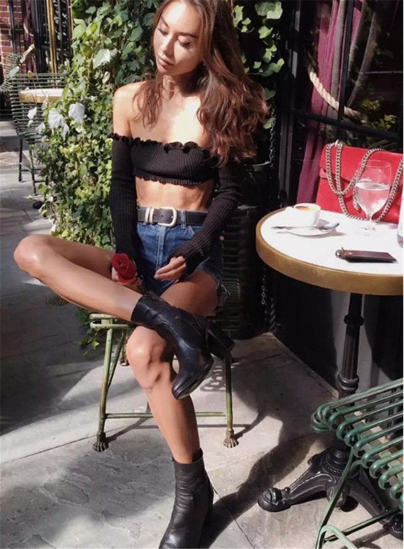 特征:纯色/无肩/无肩带荷叶边/长袖/修身/短筒作物上衣