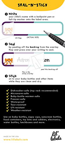 Also use on lunch containers, sippy cups, water bottles, sunscreen bottles, food containers, baby wipe tubs and more.