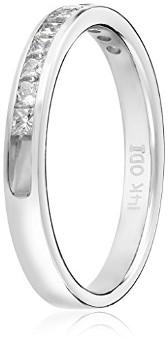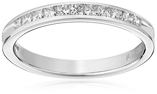 Celebrate the romantic look of the princess-cut diamond with the Women's 14k White Gold Diamond Anniversary Ring. 11 princess-shaped diamonds fill the top of a 14k white gold band, creating a modern look in their channel setting. The structured look of the diamonds shows off their good cut, accentuating the quality and precision used to create the beautiful ring. The diamonds hold 1/2 cttw. This anniversary band makes a classic addition to her fine jewelry collection and can be worn on any finger to remind her every day of your love.Feature