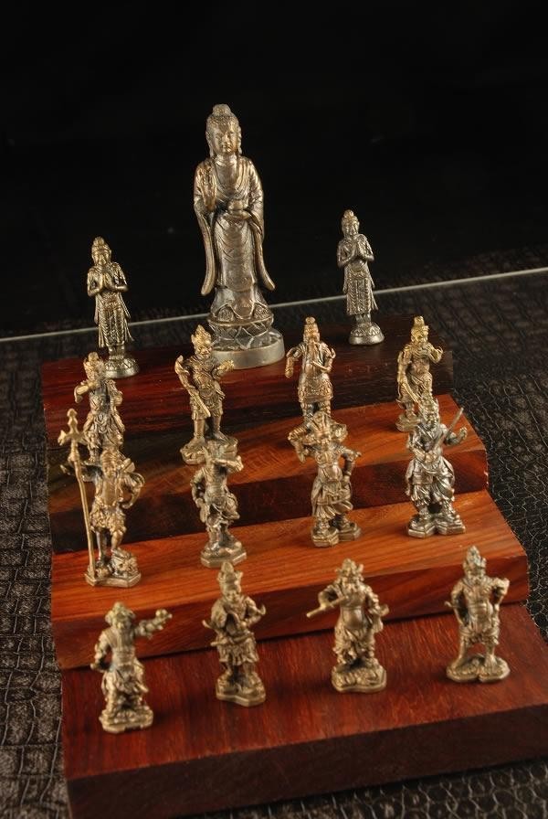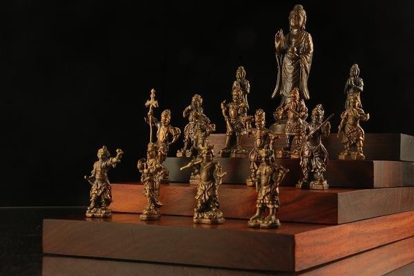 薬師三尊(薬師・日光・月光)と、まわりを十二神将がご守護のために囲んでおります。小さなスペースで奥深い仏教美術の世界を堪能していただけます。