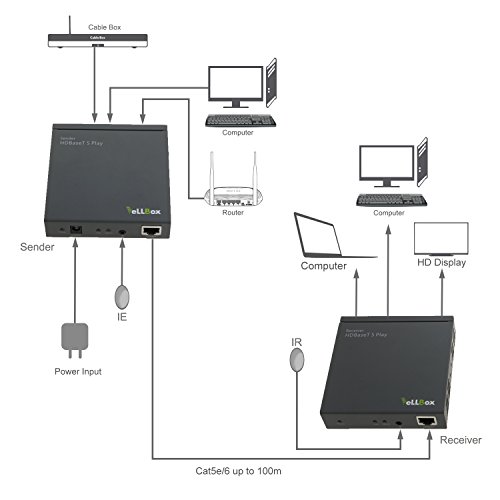 VeLLBox HDBaseT 5 Play Extend to 100m Support resolution up to 1080p This HDBaseT HDMI Extender extends an HD source with multi-channel digital audio, video and IR to the display ,also extends Ethernet Support POE (Power Over Ethernet) function that makes customer only require one 48V/1A power supply for the sender Built-in IR extender function that means using the remote-controller of the source to control IR from the display side And the transmission distance between the source and display can be up to 100m over one CAT6 cable Easily controls the source by IR extender function when the display is away from the source The main unit consists of one sender and one receiver, and they are small in size101x101x25mm When you need to extend the transmission distance up to 100m (approximate328ft),please better choose CAT 6 cable
