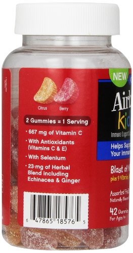 -. Binding : Health and Beauty -. Brand : Airborne -. Feature : Vitamin C 667mg and other antioxidants per serving support your immune system / Herbal blend with Echinacea and ginger also helps support your immune health / Excellent source of zinc, selenium, manganese and magnesium / Vitamin C gummy formula for kids / Delicious citrus, mixed berry, and grapefruit-flavored chewable gummies -. Label : Airborne -. Manufacturer : Airborne -. MPN : 4786518576 -. PartNumber : 4786518576 -. ProductGroup : Health and Beauty -. ProductTypeName : HEALTH_PERSONAL_CARE -. Publisher : Airborne -. Studio : Airborne -. Title : Airborne Kids Immune Support Supplement with Vitamin C Chewable Gummies