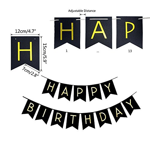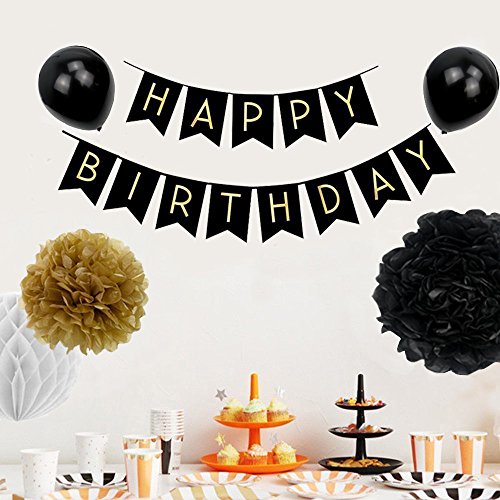 -. Feature : Package contains 1x HAPPY BIRTHDAY banner, 4 gold paper lanterns, 4 white pom poms, 9 paper pom poms / Color: black, white, gold, silver; Pom poms in different colors, sizes and styles are perfect for decorating your room / Reusable, made of high quality paper towels, easy to store and can be used multiple times / The quality happy birthday banner with the balloons is a good way to celebrate, also the perfect decoration to welcome your guests / Simple assembly: just follow the instructions on the illustration picture to make your pom poms and lanterns