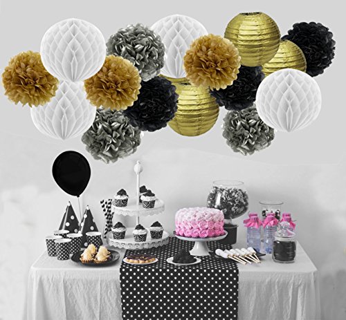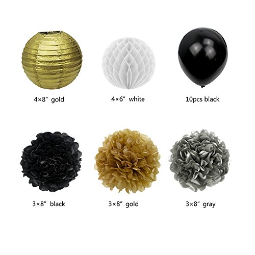 -. Title : JUSLIN 28pcs Black and Gold Paper Pom Poms Paper Lanterns Folding Fan Banner Balloon, for Birthday Party Decoration