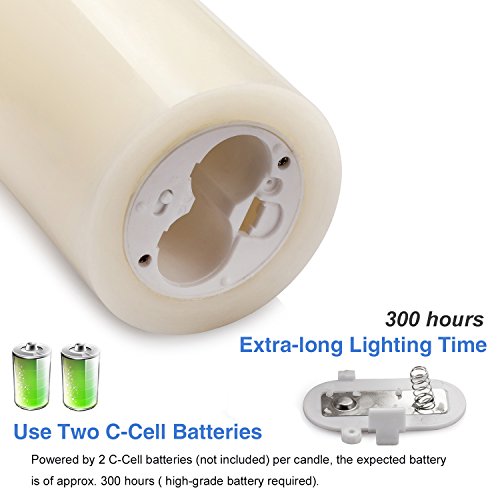 Powered by 2 C-Cell batteries (not included) per candle, the expected battery life is of approx. 300 hours (high-grade battery required). The lifetime of LED Lamp is 50,000 hours.
