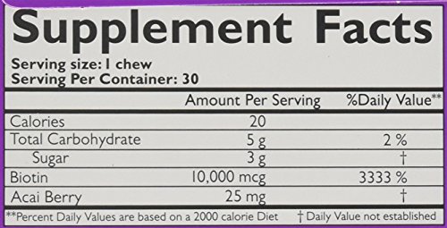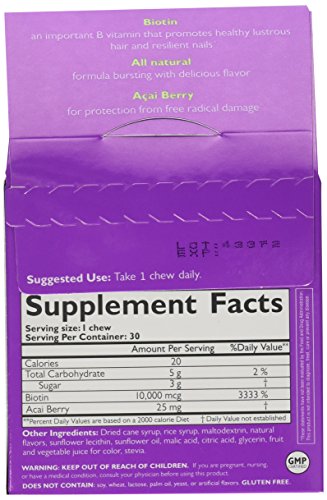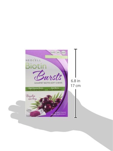 Gluten Free. Soy Free. Palm Oil Free. No Artificial Flavors. 10,000 mcg Biotin. Gourmet Biotin Soft Chews. High Potency Biotin - Hair, Skin & Nail Health. Acai Berry - Super. Antioxidant. Brazilian Acai Berry. Dietary Supplement. GMP Certified. Biotin an important B vitamin that promotes healthy lustrous hair and resilient nails. All natural formula bursting with delicious flavor. Acai Berry for protection from free radical damage. Having beautiful and radiant skin has never been so easy- or so delicious. NeoCell Biotin Bursts deliver high absorption beauty nutrients in delectable, gourmet soft chews. Biotin, an important B-vitamin, promotes healthy hair, skin and nails as well as energy support. This high potency formula supports the metabolism of proteins in the body creating natural energy, luxurious hair, resilient nails and vibrant skin. NeoCell Biotin Bursts are designed to nourish your beauty from the inside out.Feature