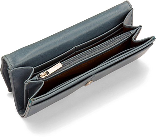 Tri-fold wallet with snap closure and zipper coin pocket on back. INTERIOR: 12 card slots, divider with zip pocket.